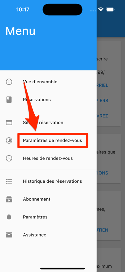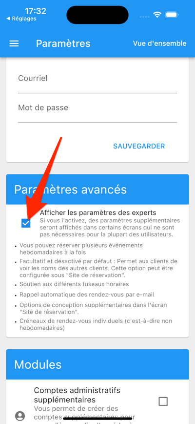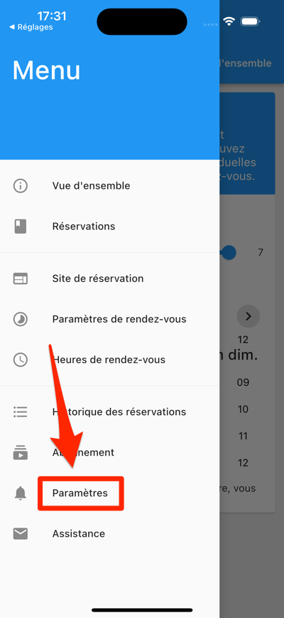 Pour trouver les champs pour la “Stripe Public Key” et la “Stripe Restricted Key” dans l’application du Système de Réservation, appuyez sur le bouton de menu dans le coin supérieur gauche de l’application du Système de Réservation et sélectionnez “Paramètres”. Activez “Afficher les paramètres des experts”.