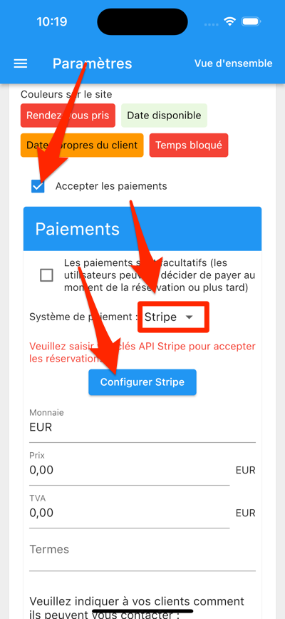 Ensuite, appuyez à nouveau sur le bouton de menu et sélectionnez “Paramètres de rendez-vous”. Activez “Accepter les paiements”, sélectionnez “Stripe” et cliquez sur “Configurer Stripe”. Là, vous pouvez entrer la “Stripe Public Key” et la “Stripe Restricted Key” et obtenir l’URL du Webhook.