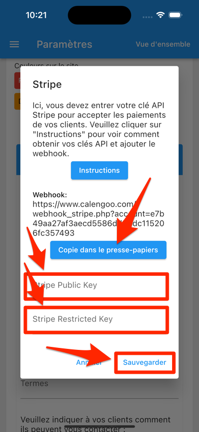 Cliquez sur la clé et copiez-la dans le champ “Stripe Restricted Key” dans l’application du système de réservation.