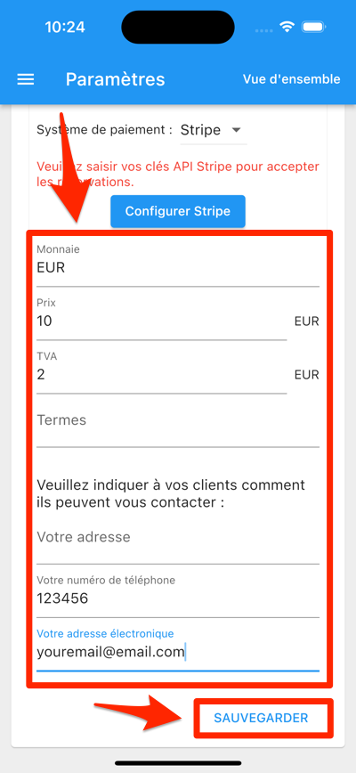 Vous avez besoin d’une Clé Publique Stripe et d’une Clé Restreinte Stripe pour l’application du Système de Réservation :