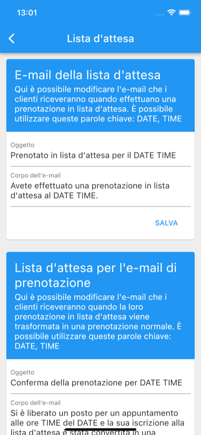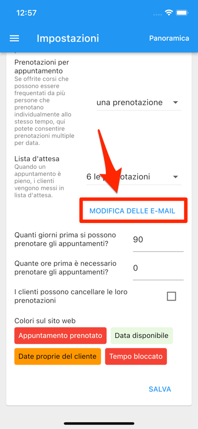 Quando si libera un posto, il cliente in cima alla lista d’attesa riceve automaticamente una prenotazione regolare e viene notificato via e-mail (se ha inserito un indirizzo e-mail nella prenotazione). Puoi modificare queste e-mail toccando “Modifica e-mail” nella schermata “Impostazioni per l’appuntamento”:
