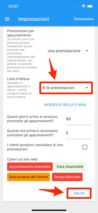 È possibile definire quanti posti in lista d’attesa ci dovrebbero essere per questo nella schermata “Impostazioni per l’appuntamento”: