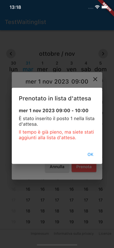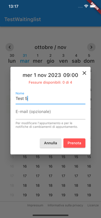 Se un orario di appuntamento è pieno, viene normalmente mostrato come occupato e non vengono accettate ulteriori prenotazioni. Tuttavia, è possibile anche impostare una lista d’attesa. In questo modo, i clienti che non sono riusciti a prenotare per quell’orario possono inserirsi nella lista d’attesa. Se si libera un posto, il loro posto in lista d’attesa viene automaticamente convertito in una prenotazione e ne vengono informati via e-mail.