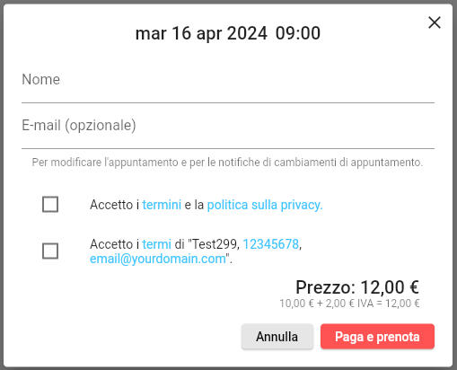 Il sistema di prenotazione supporta una funzione di pagamento che puoi utilizzare per consentire ai tuoi clienti di pagare quando prenotano un appuntamento. Si prega di contattare booking@calengoo.com se si desidera utilizzare tale funzione in modo che possa essere attivata per il tuo account.
