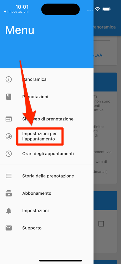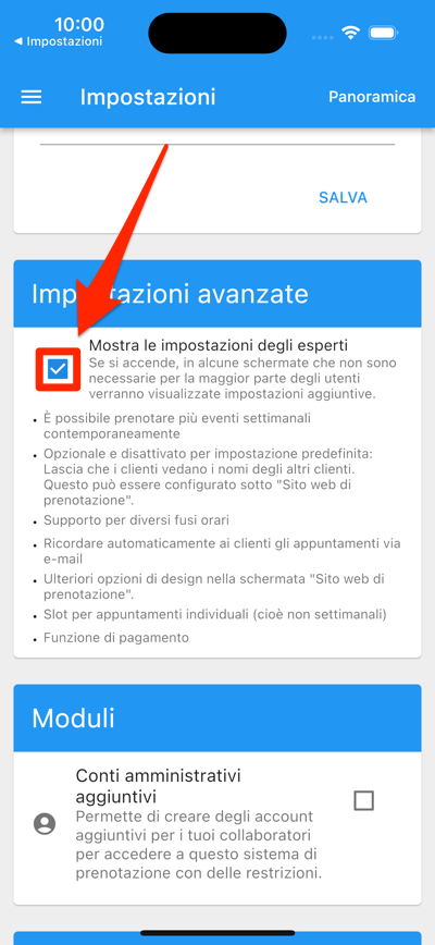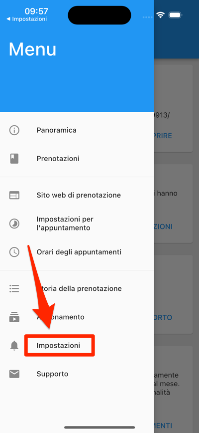 Per trovare i campi per la “Chiave Pubblica” e la “Chiave Ristretta” nell’app del Sistema di Prenotazione, premi il pulsante del menu nell’angolo in alto a sinistra dell’app del Sistema di Prenotazione e seleziona “Impostazioni”. Attiva “Mostra le impostazioni degli esperti”.