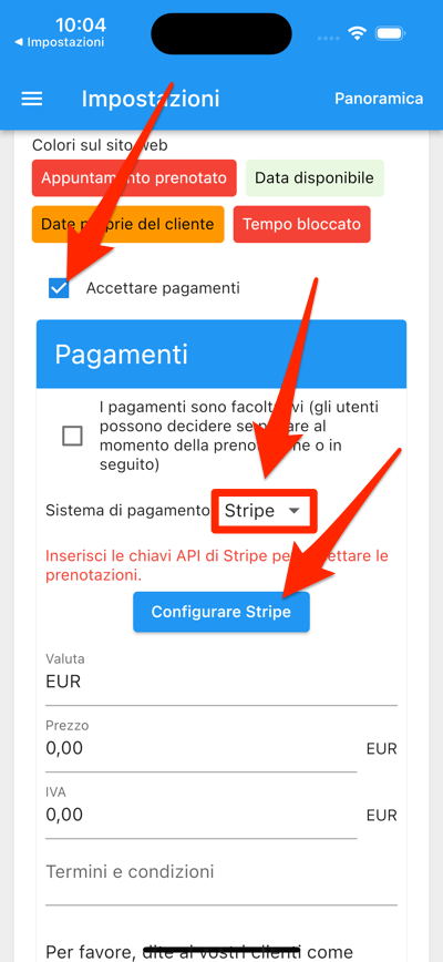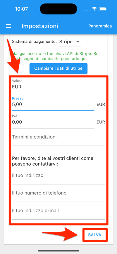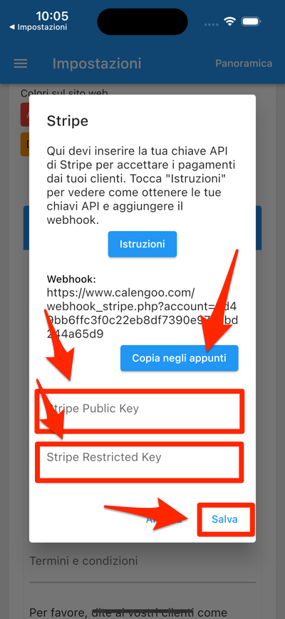 Hai bisogno di una Chiave Pubblica Stripe e di una Chiave Ristretta Stripe per l’app del Sistema di Prenotazione: