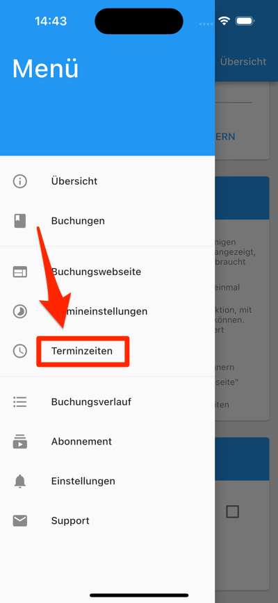 Tippen Sie dann erneut auf die Menütaste in der oberen linken Ecke, wählen Sie “Termin-Einstellungen” und setzen Sie “Anzahl aufeinanderfolgender Terminblöcke, die zusammen gebucht werden können” auf “Liste”: