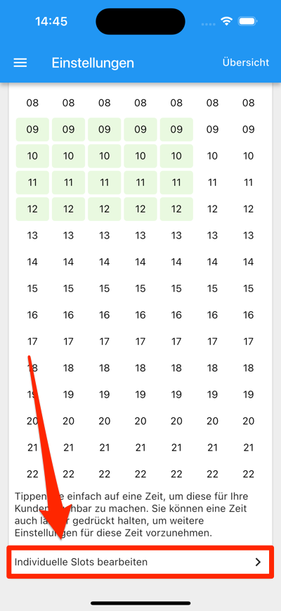 Oder Sie können den Bildschirm „Terminzeiten“ öffnen und am Ende des Bildschirms „Individuelle Slots bearbeiten“ auswählen. (Falls dieser Knopf nicht angezeigt wird, müssen Sie noch “Experteneinstellungen anzeigen” im “Einstellungen” Bildschirm einschalten.)