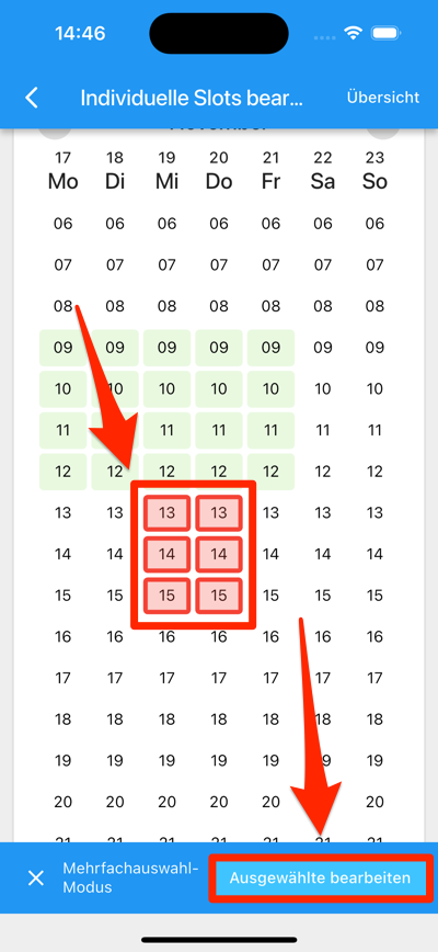 Dort können Sie auch mehrere Slots auf einmal bearbeiten, indem Sie lange auf sie drücken: