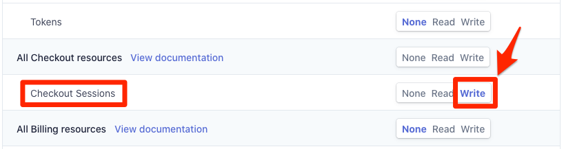 Klicken Sie bei „Checkout Session“ auf „Write“, um dem Buchungssystem (nur) zu erlauben, Checkout-Sessions zu erstellen, in denen Personen für die Buchung Ihrer Termine bezahlen können: