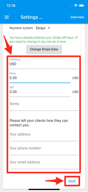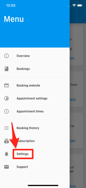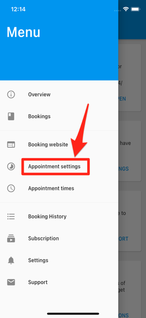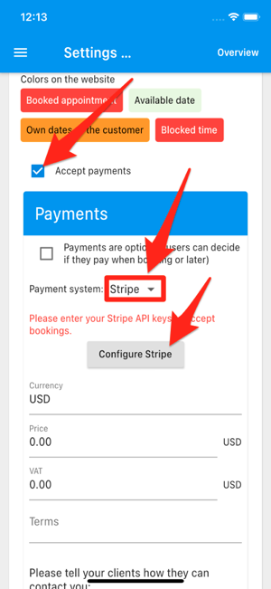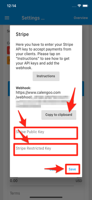 Tippen Sie dann erneut auf die Menü-Taste und wählen Sie „Appointment settings“. Aktivieren Sie „Accept payments“, wählen Sie „Stripe“ und klicken Sie auf „Configure Stripe“. Dort können Sie den „Public Key“ und den „Restricted Key“ eingeben und erhalten die Webhook-URL.