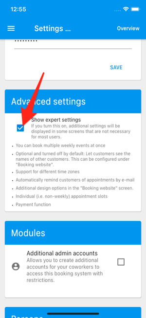 Um die Felder für den „Public Key“ und den „Restricted Key“ in der Booking System App zu finden, tippen Sie bitte auf die Menü-Taste oben links in der Booking System App und wählen Sie „Settings“. Aktivieren Sie „Show expert settings on“.