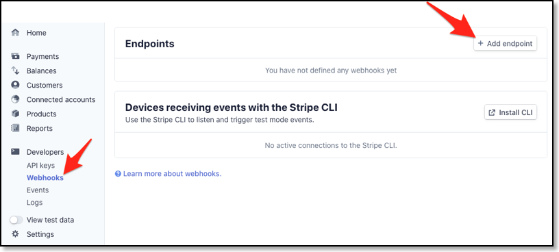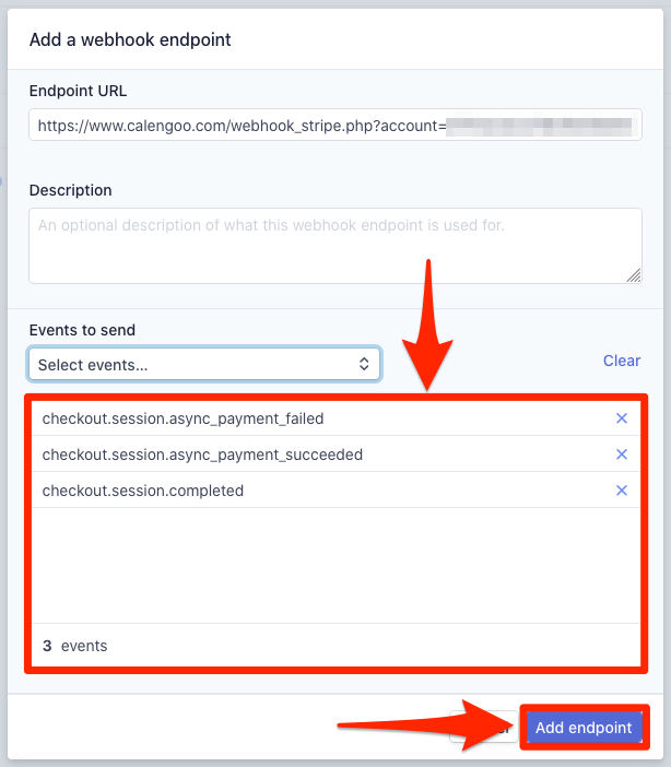 Klicken Sie links auf der Stripe-Website auf „Webhook“ und dann auf „Add endpoint“. Setzen Sie die „Endpoint URL“ auf die URL, die im Buchungssystem angezeigt wird (Sie können sie durch Tippen auf „Copy to clipboard“ kopieren und dann in die Stripe-Website einfügen). Klicken Sie anschließend auf „Select events…“ und wählen Sie „Checkout 3 events“. Danach klicken Sie auf „Add endpoint“.